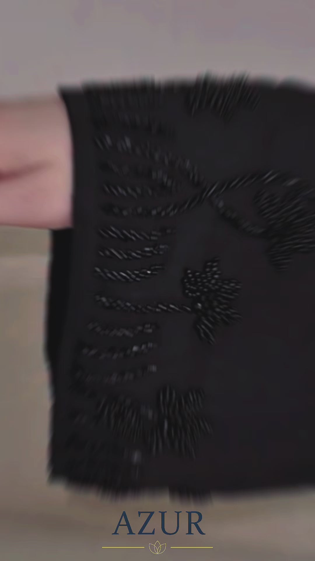 Gracefully minimal with refined detailing, this AZUR black inner and gown set is crafted in premium double georgette for a fluid, elegant drape. The outer gown features delicately embellished sleeves with subtle beadwork, adding just the right touch of sophistication while keeping the overall look timeless and modest. Paired with a matching inner for complete coverage, this ensemble is perfect for formal gatherings, evenings, and elevated everyday wear.