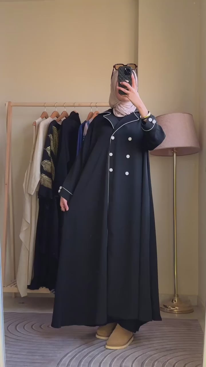 Elevate your modest wardrobe with this elegant double-breasted abaya, crafted from premium double georgette fabric. Featuring a sophisticated buttoned front with contrast piping details, this abaya offers a structured yet flowy silhouette. Perfect for both formal and casual occasions, it exudes timeless grace and comfort.