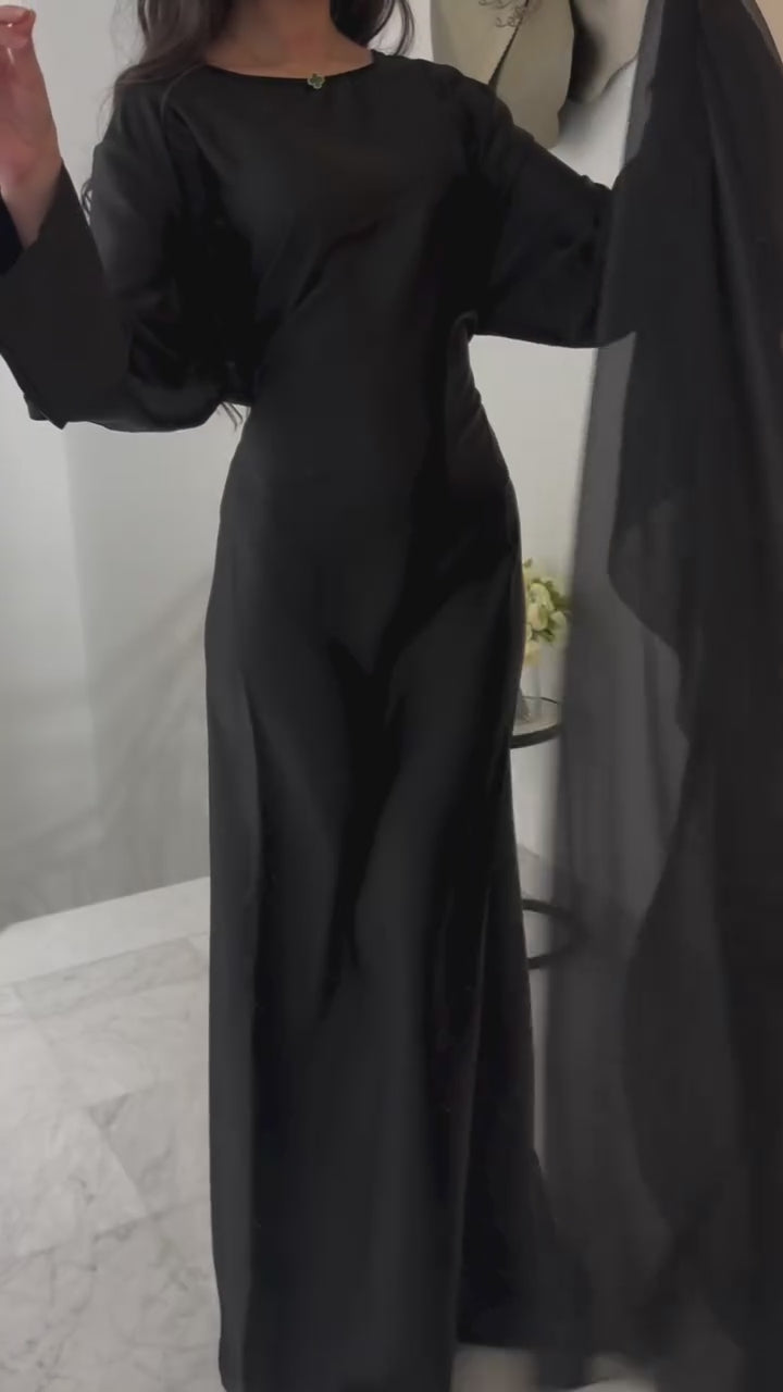 Make a bold statement with our Elegant Black Flow Gown, crafted from luxurious double georgette with a dreamy organza overlay. The soft, flowing fabric drapes gracefully, while the sheer organza sleeves and cape add a touch of ethereal charm. Perfect for formal evenings and special occasions, this timeless piece exudes effortless sophistication.