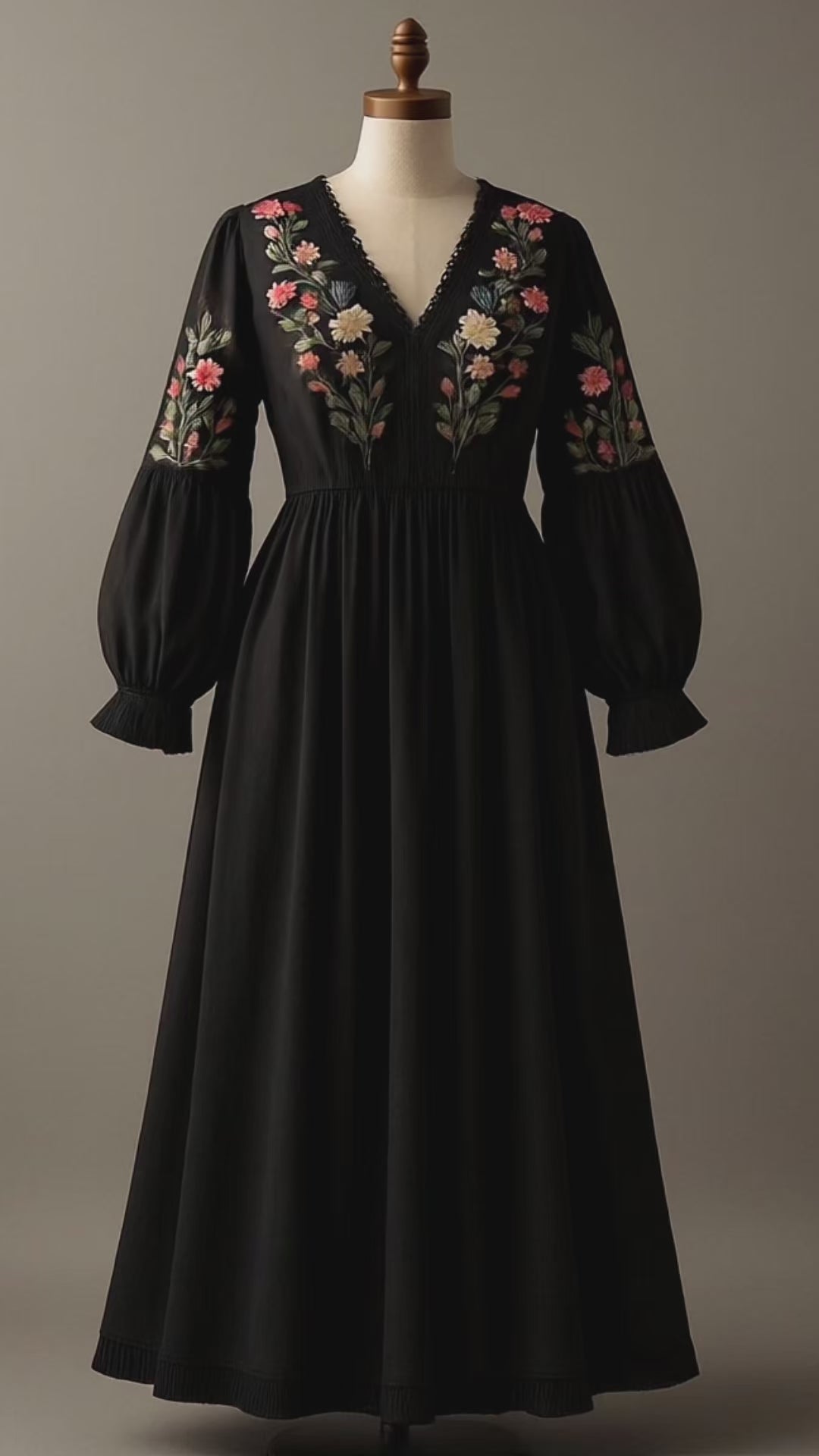 A timeless piece blending elegance with artistry, this black maxi dress is crafted from soft, flowy double georgette fabric. Featuring intricate floral embroidery in vibrant tones across the bodice and sleeves, it’s designed with a flattering V-neckline and voluminous bishop sleeves with gathered cuffs. The gently cinched waist flows into a graceful, full-length skirt, perfect for formal gatherings or a romantic evening out.