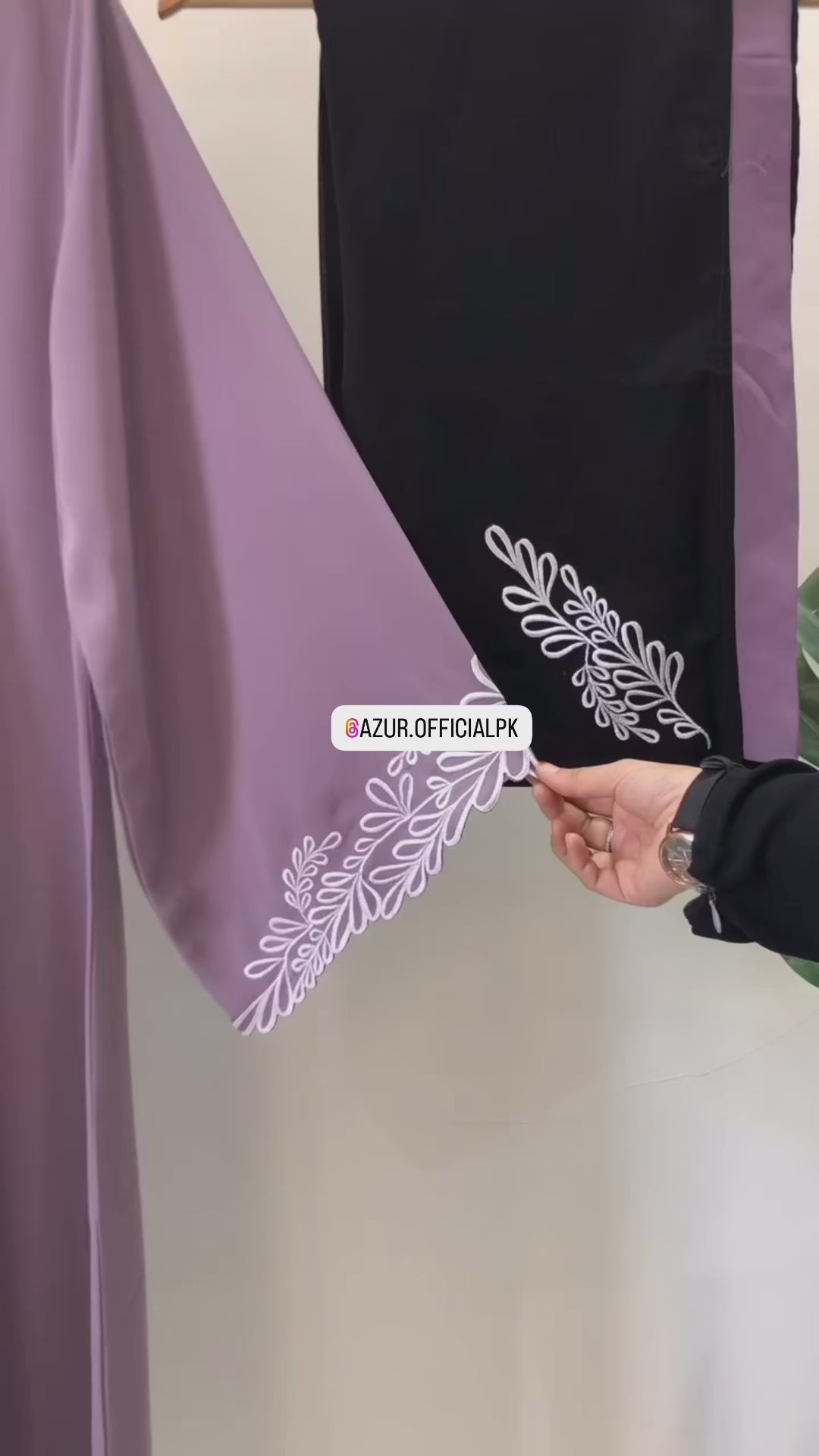 Embrace elegance with this Lavender Blossom Abaya, designed in premium double georgette for a graceful flow and lightweight comfort. This piece features delicate white leaf embroidery on the sleeve cuffs, adding a soft feminine touch. The abaya has a sleek, modern cut with a hidden front opening, perfect for formal or casual wear. Complete the look with the matching black stole, adorned with a coordinating embroidered motif and lavender border.