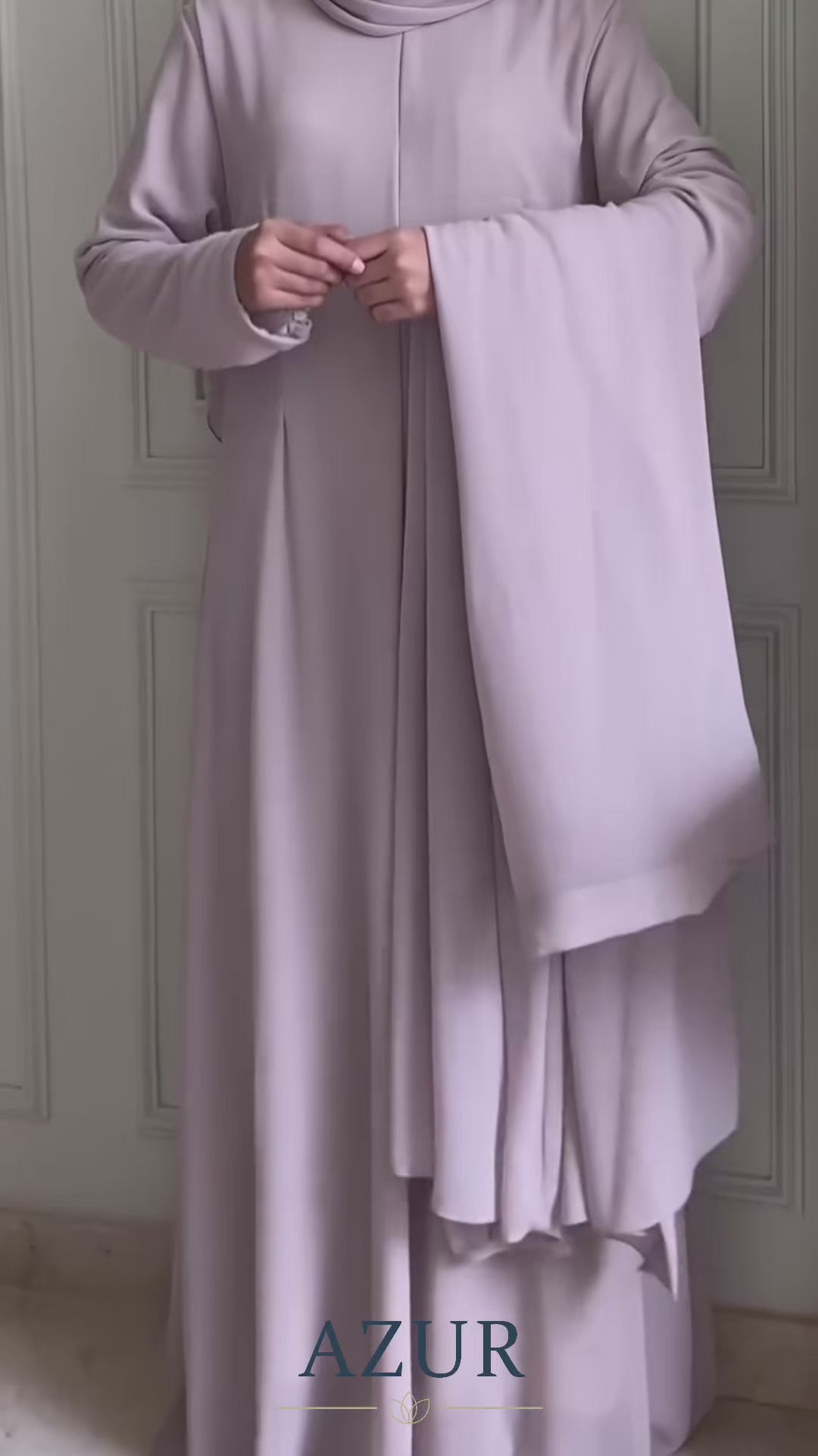 This refined open-front gown is designed for effortless elegance and graceful movement. Crafted from fluid double georgette, it features delicately embellished bell sleeves that add a subtle statement without overpowering the silhouette. The open design is paired with a perfectly coordinated inner, creating a polished and complete look suitable for formal occasions, gatherings, and elevated everyday wear. A timeless piece that blends modesty with modern sophistication.