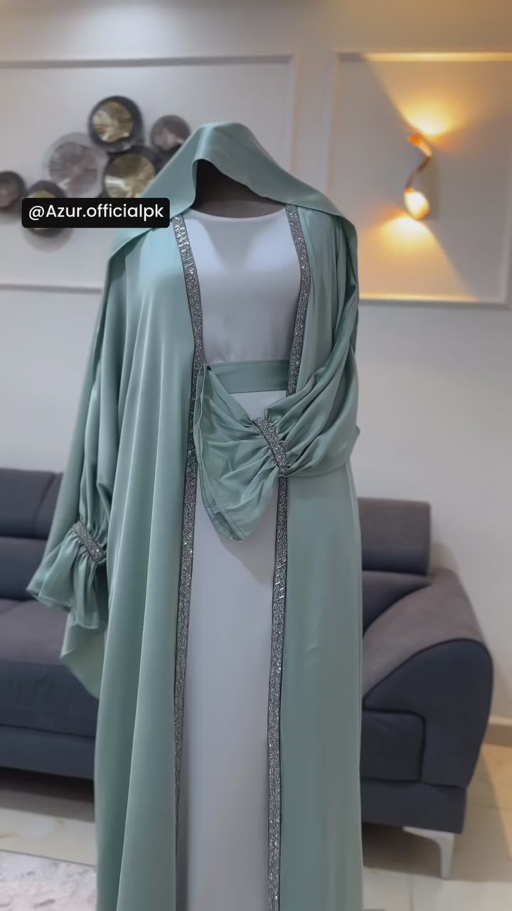 A luxurious silk abaya set featuring a beautifully embellished open-front gown paired with a sleek inner dress. The delicate detailing along the edges and gathered sleeves add a refined touch, making it a perfect choice for special occasions. Designed for grace and sophistication.