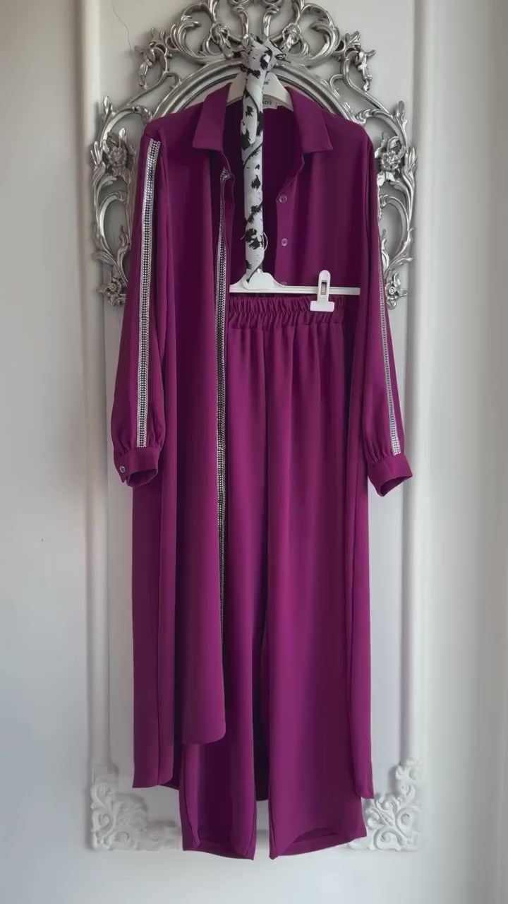 Step into effortless style with this chic co-ord set crafted from premium double georgette. The long button-down top features sleek detailing along the sleeves for a modern touch, paired with relaxed-fit trousers for all-day comfort. Perfect for casual outings or semi-formal events, this set combines elegance with contemporary flair.