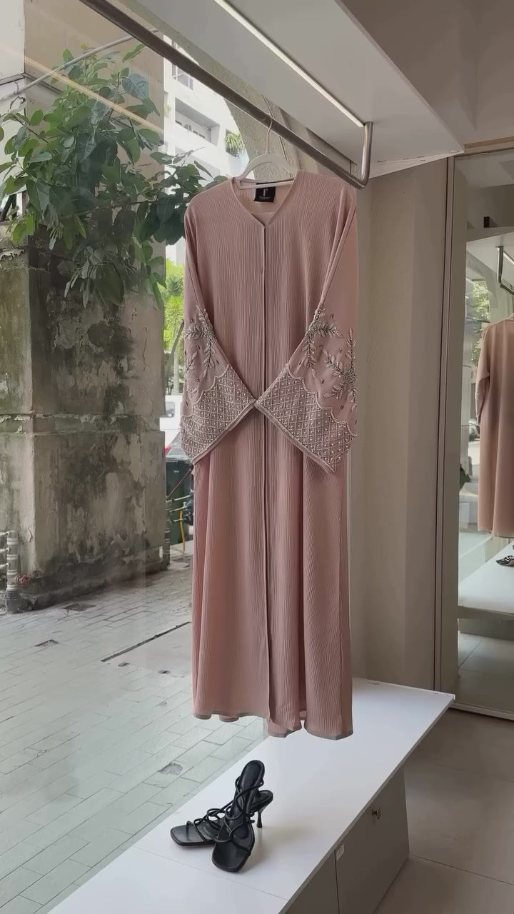 Exude timeless grace with this crushed silk abaya, featuring intricate hand-embellished sleeves adorned with delicate pearls and floral patterns. The soft texture of the crushed silk drapes beautifully, while the detailed craftsmanship on the sleeves adds a touch of sophistication, making it perfect for both casual and formal occasions.