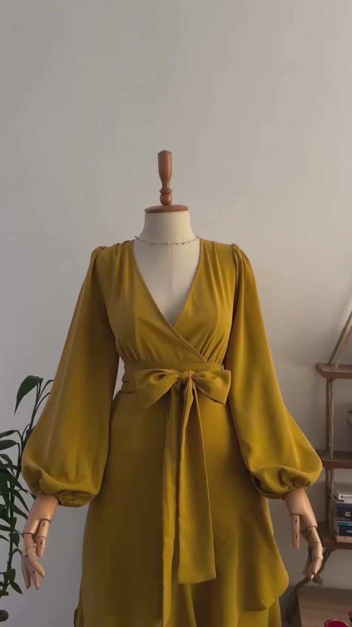 Turn heads in our stunning mustard wrap dress, crafted from luxurious double georgette for a soft, flowing silhouette. The flattering V-neckline, billowy sleeves, and waist-defining bow add a touch of elegance to your wardrobe. Perfect for both casual and formal occasions, this versatile piece combines effortless style with timeless sophistication.