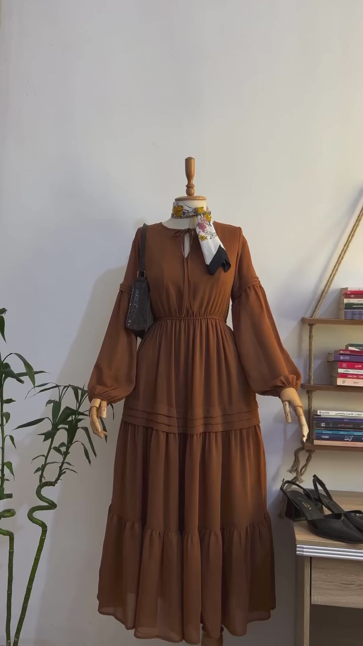 Embrace timeless charm with this tiered flowy dress, crafted from luxurious double georgette. The soft, breathable fabric drapes gracefully, while the tie-neck detail adds a touch of elegance. The tiered silhouette and elastic waist offer a flattering fit, making it perfect for casual outings or semi-formal gatherings.