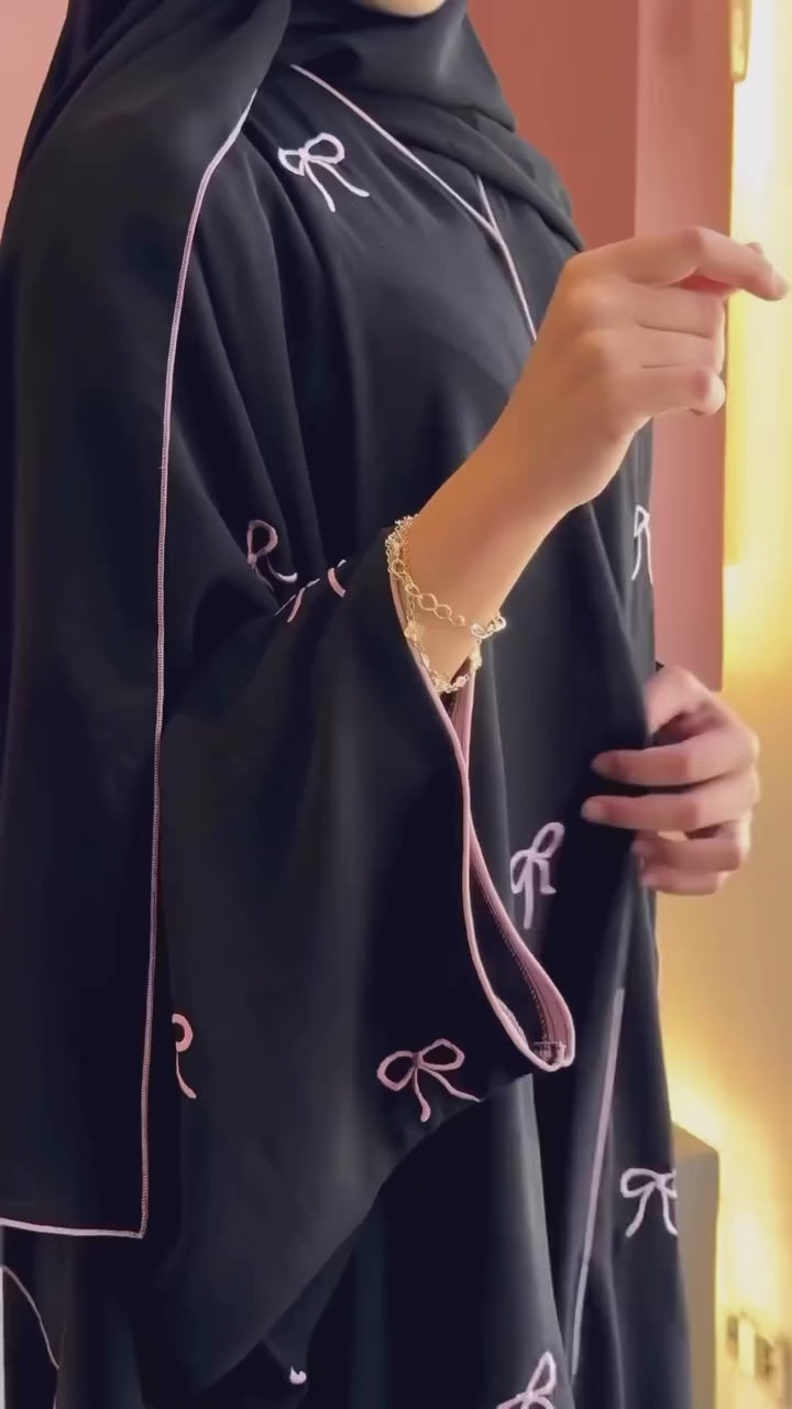 Made from double georgette, this stylish abaya features delicate bow embellishments and contrasting trim detailing for a chic, modern look. Perfect for everyday elegance.