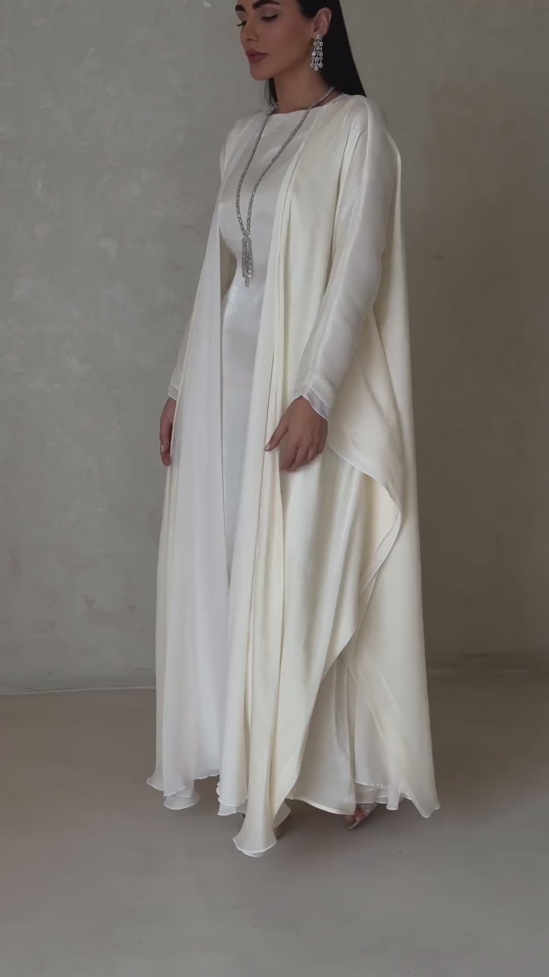 This elegant chiffon silk open abaya comes with a matching inner, featuring a soft, flowy drape. Perfect for a timeless, sophisticated look.