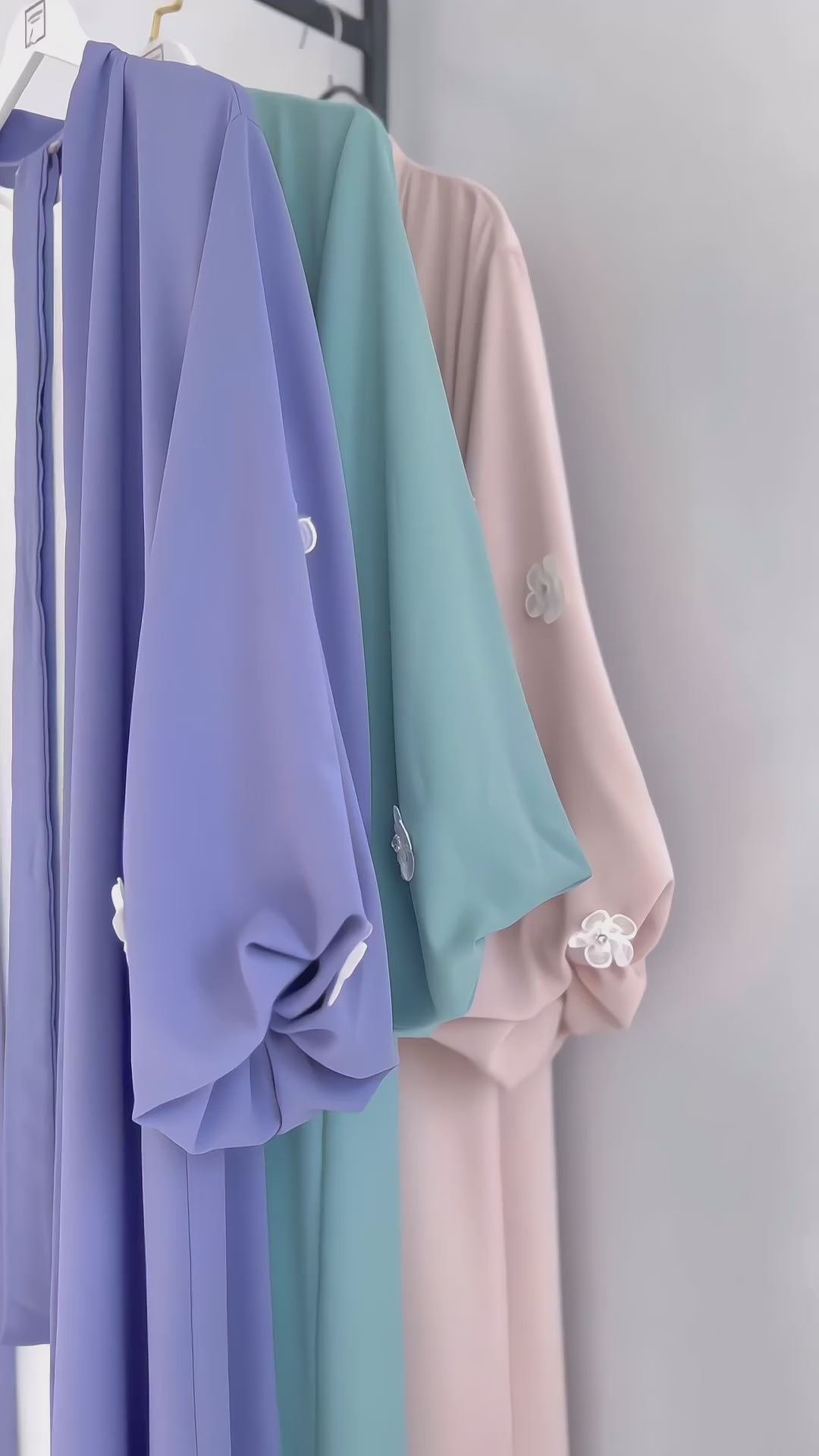 This elegant abaya set includes a soft inner dress and a flowy open abaya with delicate floral embellishments on the sleeves. Perfect for a graceful and modest look.