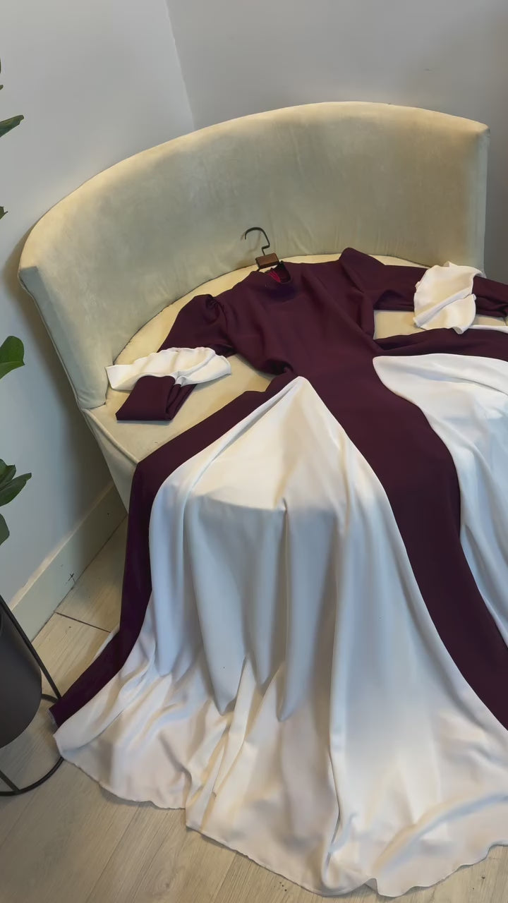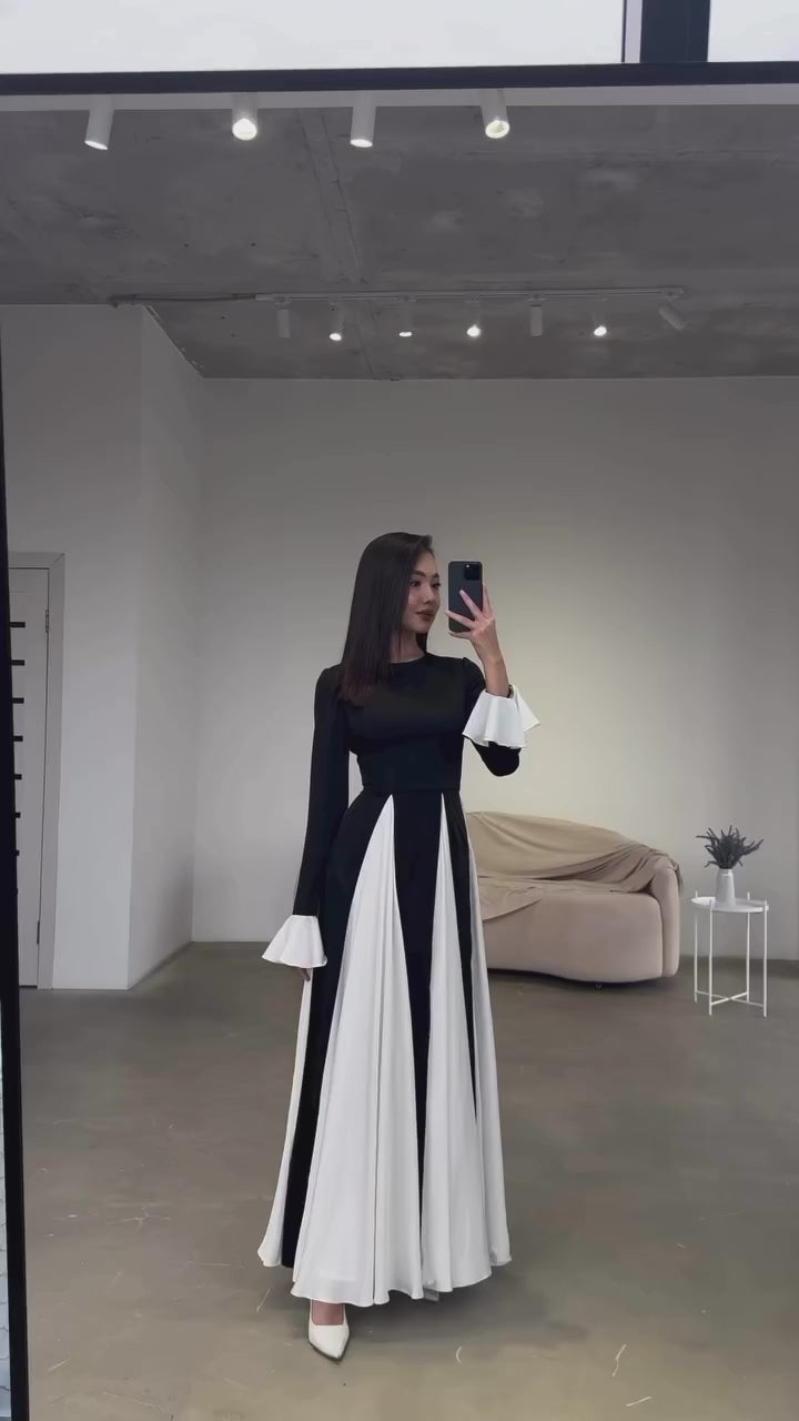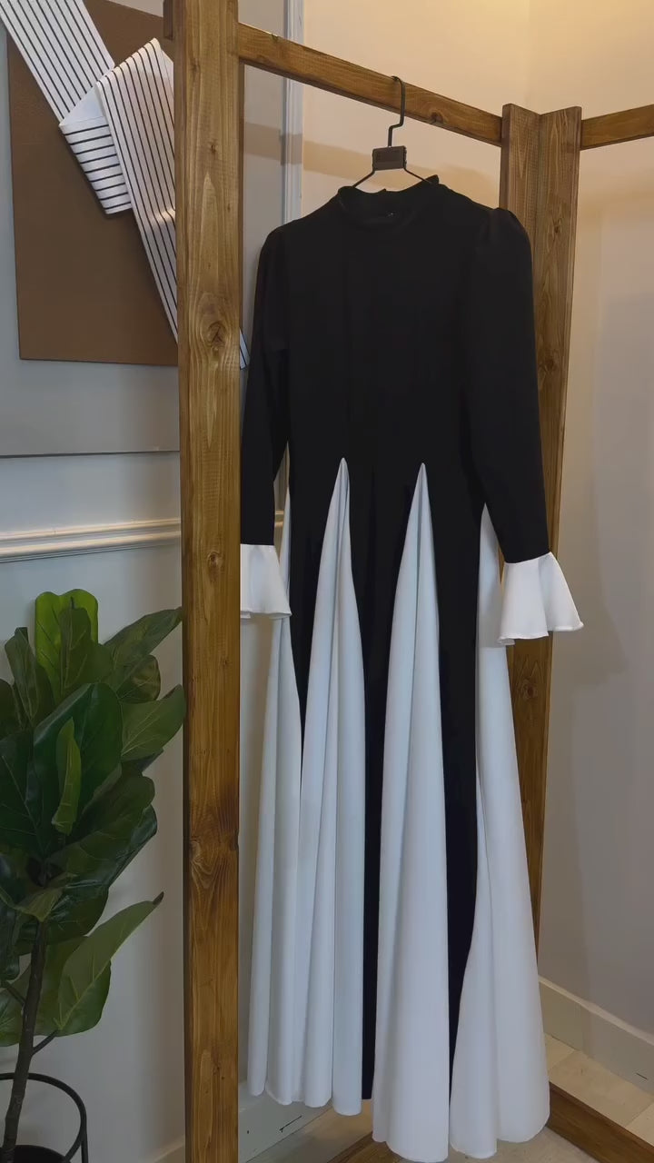 Make a bold statement with this elegant double georgette dress featuring striking contrast panels and flared cuffs. The flowing fabric ensures a graceful drape, while the timeless design makes it perfect for both formal and casual occasions. A sophisticated addition to any wardrobe.
