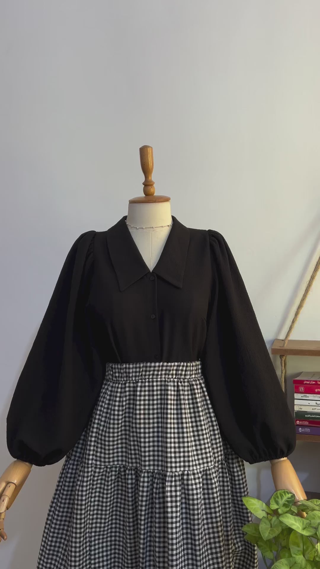 This effortlessly chic ensemble pairs a structured double georgette shirt with voluminous sleeves and a timeless gingham cotton skirt. The fitted waist and flowy silhouette make it a perfect choice for both casual and elegant looks. A must-have for your wardrobe!