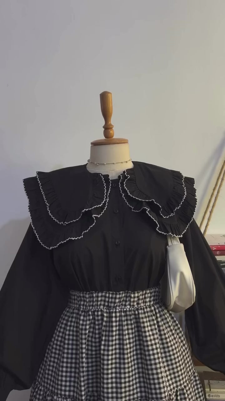 This chic ensemble features a double georgette shirt with a statement ruffled collar, delicately adorned with fine lace trim for a timeless look. Paired with a classic gingham cotton skirt, this outfit blends elegance and comfort effortlessly. Perfect for casual outings or a stylish day out, this versatile set is a must-have addition to your wardrobe.
