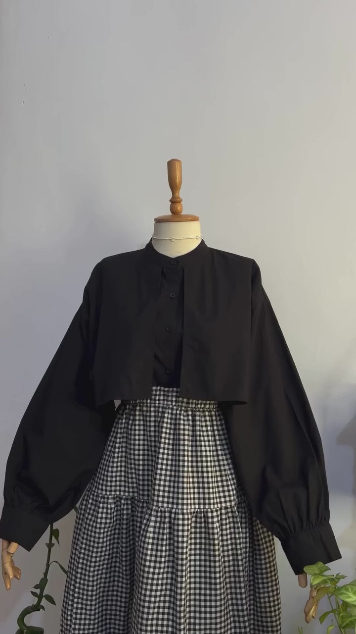 Stay effortlessly stylish with our Chic Gingham Cotton Set. This versatile ensemble features a trendy cropped jacket-style shirt with a mandarin collar and puff sleeves, paired with a classic gingham-patterned skirt. Crafted from breathable cotton, this set offers both comfort and style for everyday wear or casual outings. A must-have addition to your wardrobe!